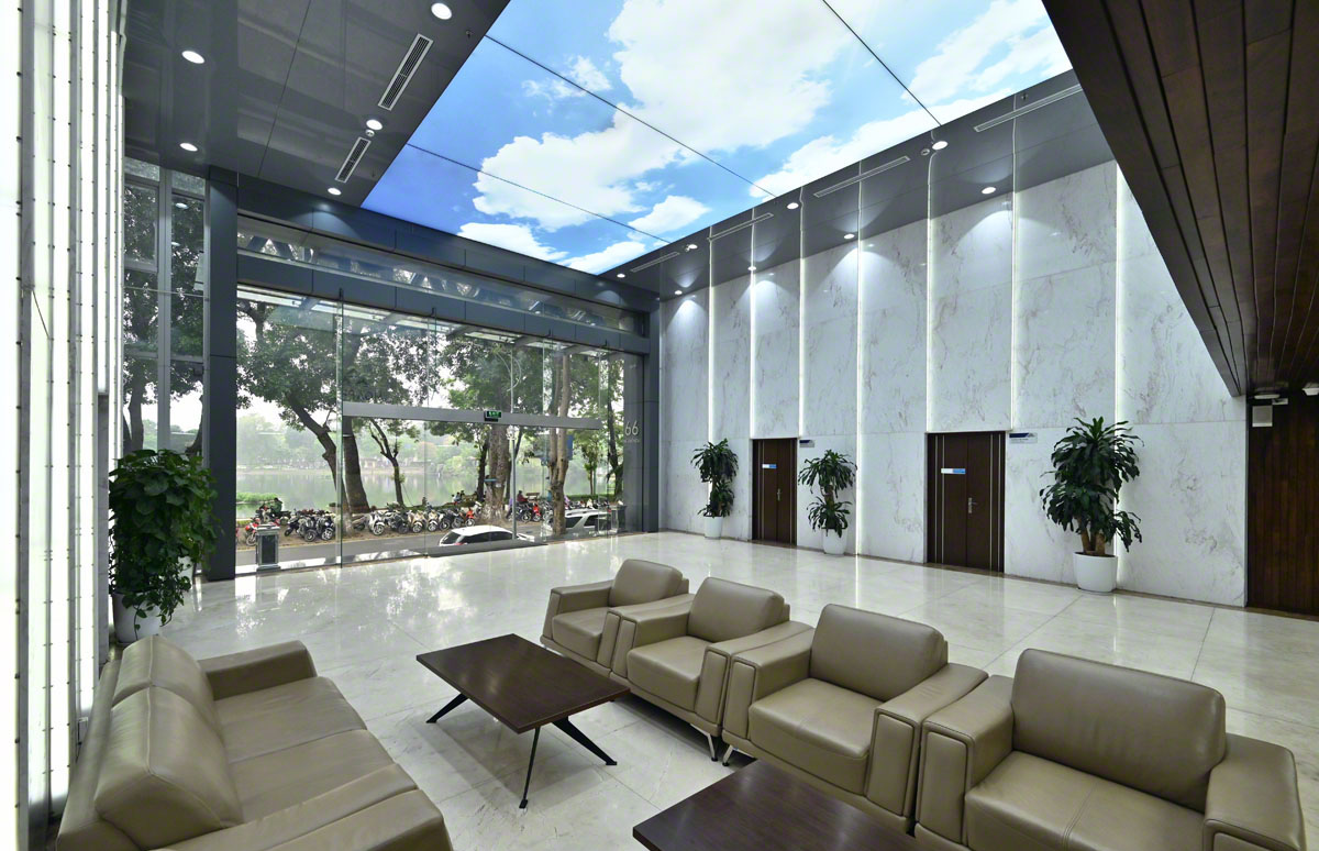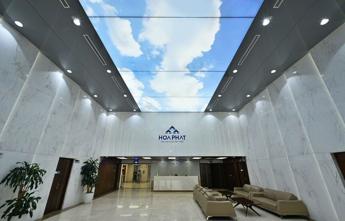 Tại sảnh chính văn phòng Hòa Phát, hệ trần in xuyên sáng được thiết kế như một “bầu trời nhân tạo”, mở ra cảm giác thoáng đãng và tràn đầy sức sống ngay giữa không gian nội thất.