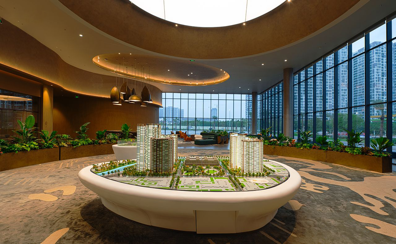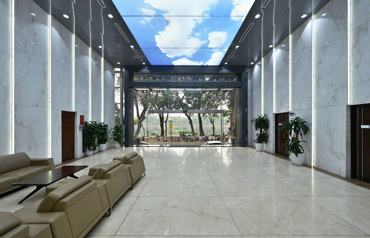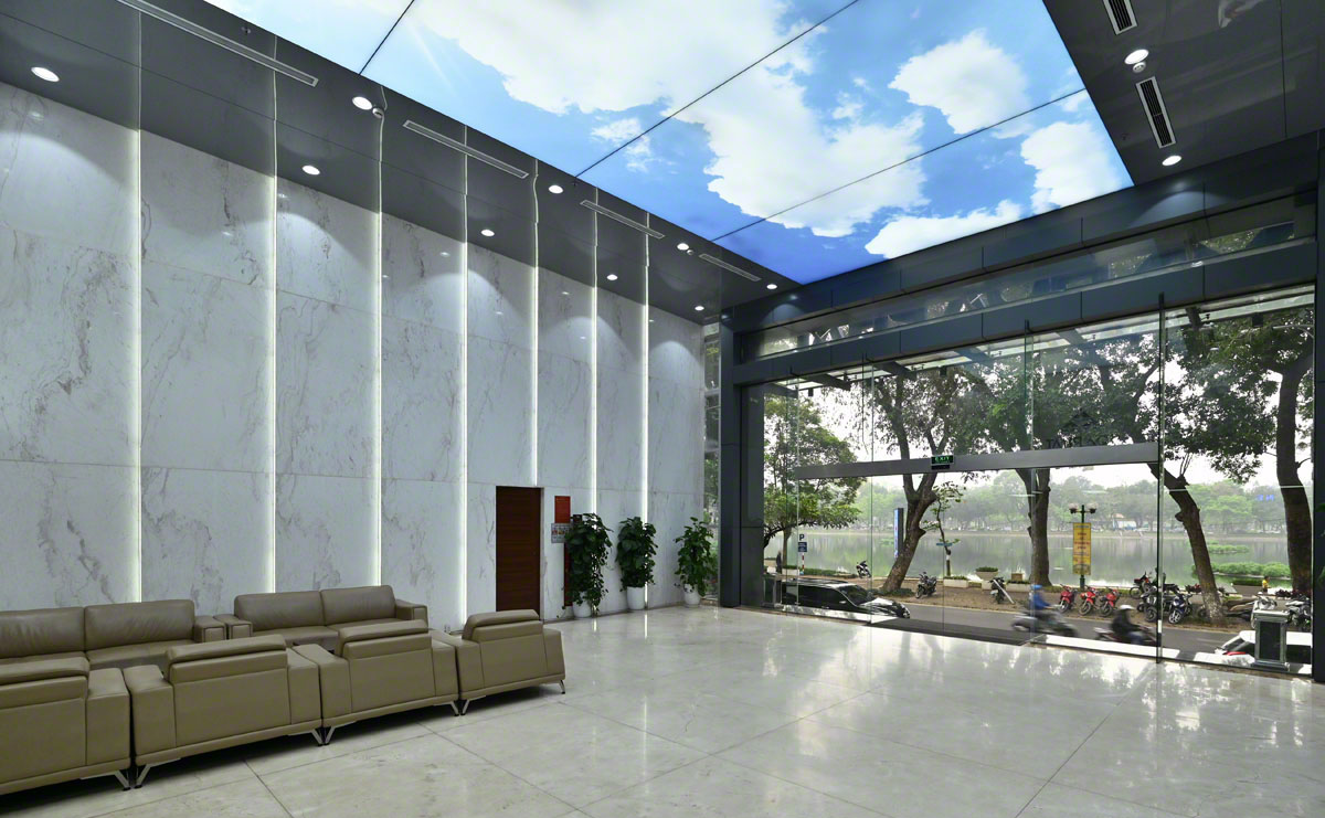 Hình ảnh mây trời in trên bề mặt xuyên sáng khổ lớn mang lại chiều sâu thị giác, đồng thời kết hợp hài hòa với ánh sáng tự nhiên từ mặt kính, tạo sự liền mạch giữa trong và ngoài.