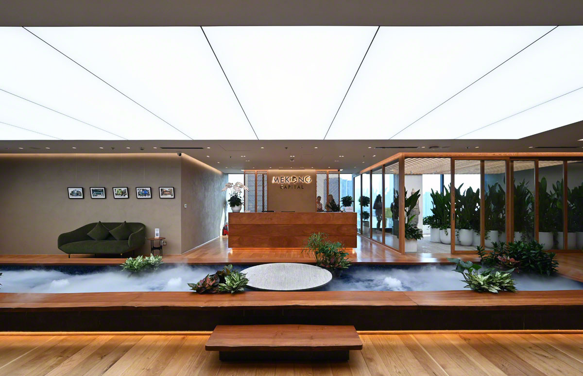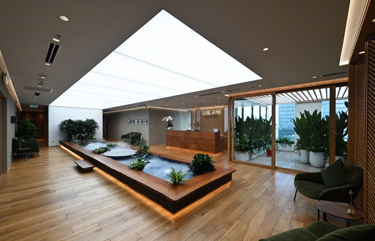 Không gian văn phòng Mekong Capital đề cao khía cạnh xã hội nơi mà đáp ứng nhu cầu về sức khoẻ, điều khiện làm việc. Không gian nội thất được kiến tạo từ các yếu tố chính đến từ tự nhiên là đá, gỗ, nước và cây xanh. Kết hợp với hệ thống chiếu sáng trần căng sáng Barrisol® đem lại không gian ánh sáng hoàn hảo nhất, tạo sự thoải mái không chói gắt, hài hoà và dịu nhẹ tương đương với ánh sáng tự nhiên.