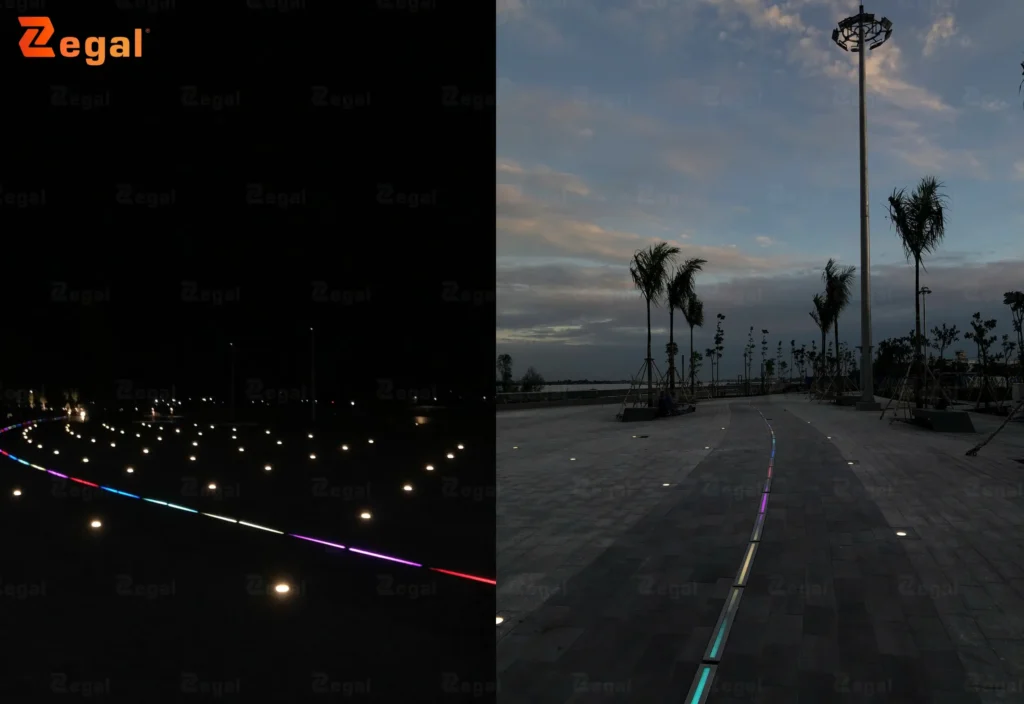 Tại quảng trường Tây Sông Hậu, điều khiển DMX được ứng dụng để tạo nên hệ chiếu sáng cảnh quan mang tính dẫn lối và kết nối không gian. Ánh sáng không chỉ chiếu sáng mặt đất, mà còn mô phỏng chuyển động, tạo cảm giác không gian luôn thay đổi.
